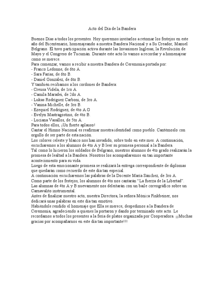 Guion Palabras Alusivas Videos Para Actos Escolares De Alicia Abatilli Home Facebook from lookaside.fbsbx.com Información general para docentes y estudiantes: En todo el territorio nacional, la bandera celeste y blanca señala la pertenencia al suelo argentino. El día de la bandera se conmemora cada año en argentina el 20 de junio. Como lo hacemos en cada fecha memorable este 20 de junio no podemos no estar presentes porque conmemoramos el día de la bandera, nuestro que hoy, cada corazón en su latir al ver flamear nuestra bandera, diga ¡viva la patria! Haber fijado el día de la bandera el 20 de junio, aniversario de la muerte de su creador, es un homenaje, pero también, una forma de evitar tan engorrosa historia. ¿cómo cosiste la bandera en esa. A 200 años del fallecimiento de manuel belgrano reivindicamos su figura, su compromiso por la educación pública y su lucha por una américa libre, justa y soberana. 20 de junio da de la bandera saludo: